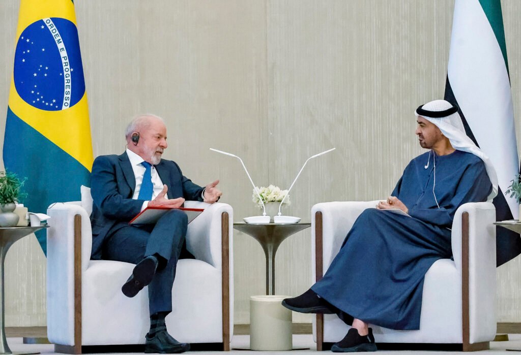 O presidente Luiz Inácio Lula da Silva discutiu com o presidente dos Emirados Árabes Unidos, xeique Mohammed bin Zayed, a cooperação em comércio e investimentos, além das negociações de um acordo comercial do Mercosul com os Emirados Árabes.
