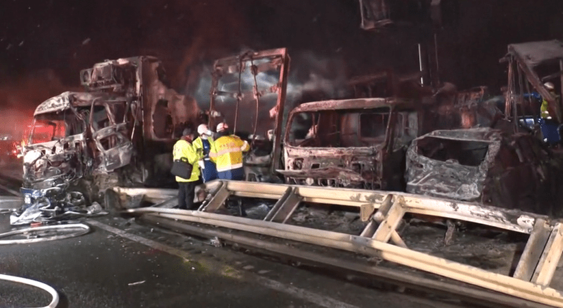 Um incêndio começou na extremidade do engavetamento, espalhando-se por 20 veículos, alguns dos quais foram completamente queimados. O incêndio foi extinto cerca de sete horas depois, informou a polícia.