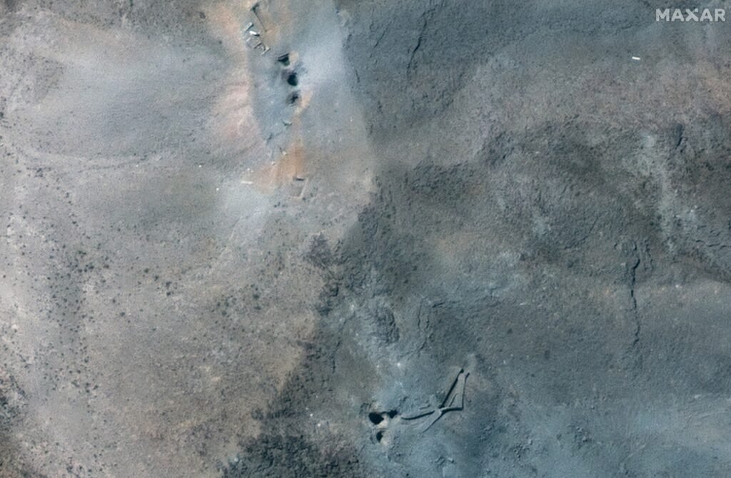 Imagem de satélite de 22 de junho mostra buracos e crateras na encosta do complexo subterrâneo de Fordow, após ataque dos EUA, perto de Qom. — Foto: MAXAR TECHNOLOGIES/via REUTERS