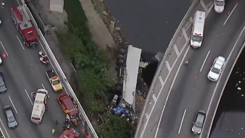 Um caminhão com 4 pessoas dentro despencou na tarde desta 4ª feira (5.nov.2025) de uma ponte na marginal Tietê, em um trecho da zona norte de São Paulo.