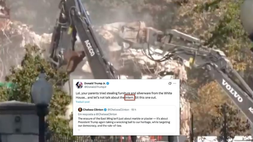 A construção de um salão de festas de US$ 200 milhões na Casa Branca levou a um bate-boca entre integrantes dos clãs Trump e Clinton nas redes sociais. Na 3ª feira (21.out.2025), Hillary Clinton, mulher do ex-presidente Bill Clinton (Partido Democrata) e candidata derrotada por Donald Trump (Partido Republicano) nas eleições de 2016, criticou em seu perfil no X a demolição de parte da residência oficial.