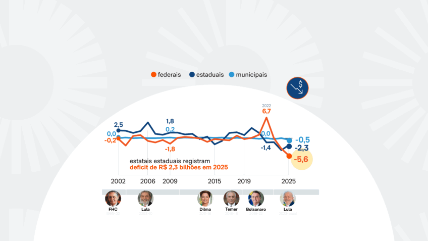 O deficit das estatais federais nos 8 primeiros meses de 2024 havia sido de R$ 3,4 bilhões. O saldo negativo aumentou 65,0% em 2025. A autoridade monetária utiliza como base a necessidade de financiamento, que mostra se as companhias estão contribuindo positivamente para reduzir o deficit público ou exig