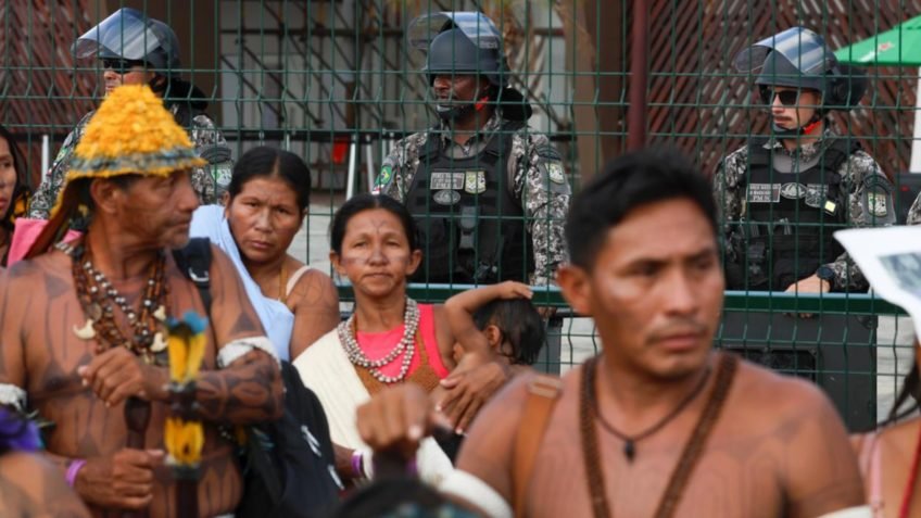 Cerca de 50 indígenas realizaram um protesto nesta 6ª feira (14.nov.2025) na entrada principal da Zona Azul da COP30 (30ª Conferência das Nações Unidas sobre as Mudanças Climáticas de 2025), em Belém. É nesse espaço que são realizadas as negociações oficiais do evento.