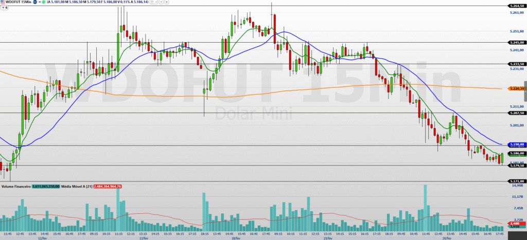 O minidólar (WDOH26), com vencimento em março, encerrou a última sessão (20/02) em queda de 0,71%, aos 5.186 pontos, ampliando a pressão vendedora no curto prazo. O dólar acompanhou o enfraquecimento da moeda americana no exterior após a Suprema Corte dos EUA derrubar tarifas de Trump. Apesar do núcleo do PCE ter vindo acima do esperado, o PIB mostrou desaceleração, reforçando a leitura de espaço para cortes de juros pelo Fed. A tensão entre EUA e Irã segue como fator de risco, mas o mercado mantém foco nos dados econômicos.