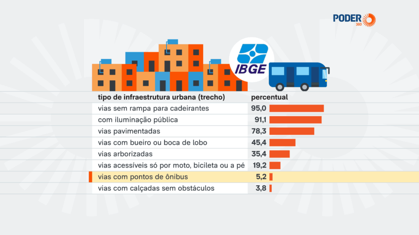 Só 5,2% dos moradores de favelas viviam em trechos de vias com ponto de ônibus ou van em 2022. Fora dessas áreas, o índice de pessoas com disponibilidade dessa infraestrutura urbana era mais que o dobro (12,1%). Os dados são do Censo 2022, do IBGE (Instituto Brasileiro de Geografia e Estatística).