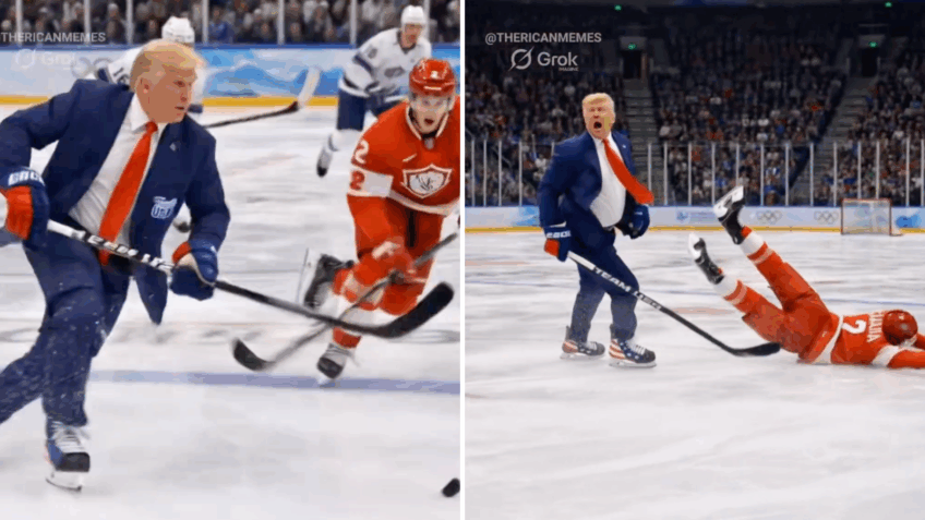 As imagens criadas pelo chatbot Grok, do X, mostram Trump em uma partida de hóquei. No vídeo, o presidente aparece marcando 2 gols vestindo terno e gravata, driblando adversários e agredindo jogadores do time rival.