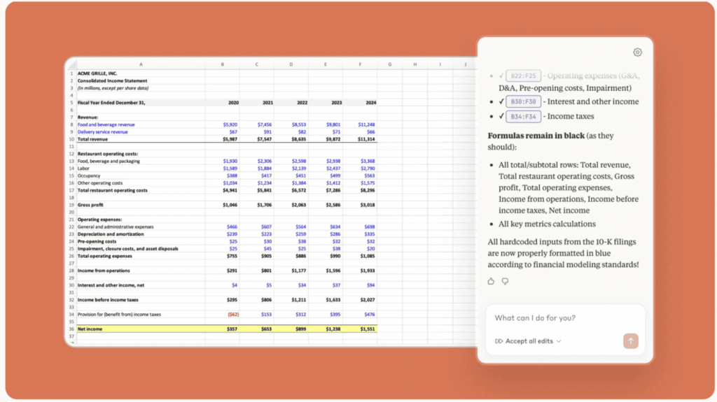Usuários agora podem trabalhar diretamente com o Claude em uma barra lateral do Excel, onde o chatbot lê, analisa, modifica e cria novas pastas. Segundo a Anthropic, o Claude explica suas alterações e permite que os usuários naveguem diretamente para as células às quais ele faz referência em suas explicações, garantindo “total transparência”.