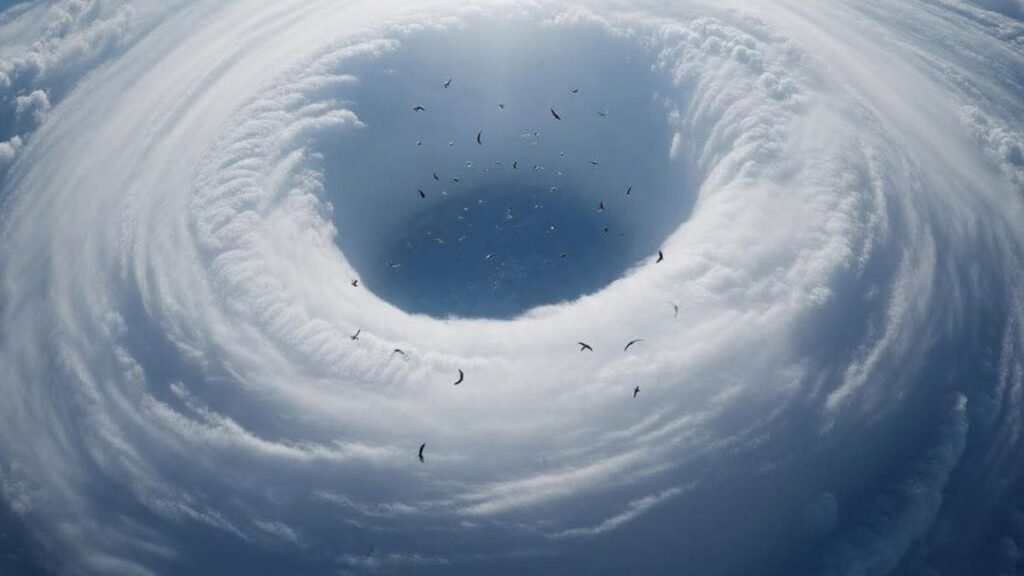 Foto feita com IA mostra aves “maiores que campos de futebol” no olho do furacão