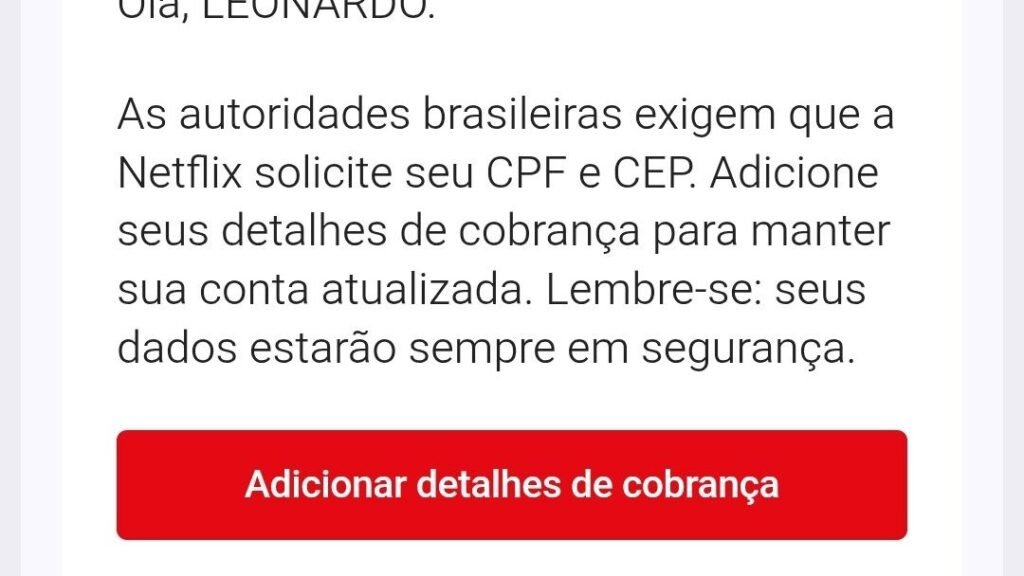 – A Netflix está solicitando CPF e CEP dos clientes para atualizar o cadastro devido à reforma tributária.